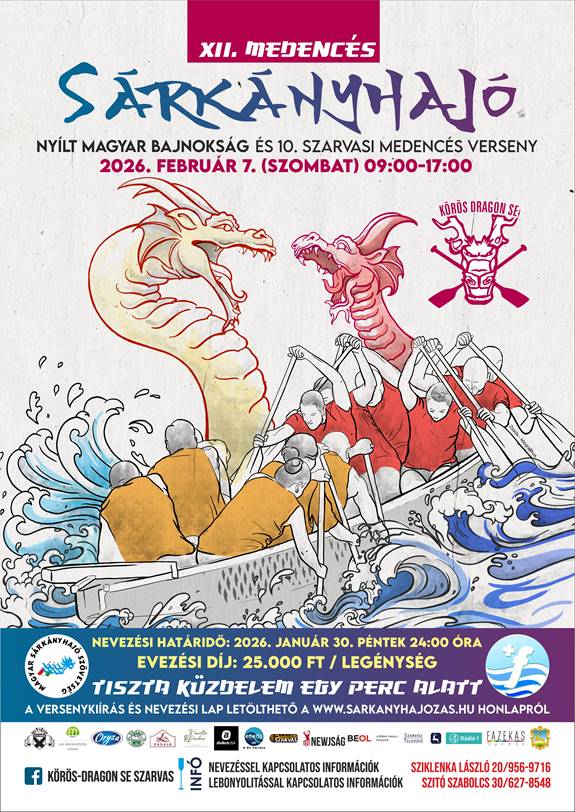 Február 7-én elindítjuk az idei sárkányhajó szezont, melynek első eseménye a 12. Medencés Sárkányhajó Nyílt Magyar Bajnokság és 10. Szarvasi Medencés Verseny lesz. A szükséges dokumentumok, versenykiírás, nevezési lap és a legénységi lista letölthető honlapunkról. Várjuk a nevezéseket! Jó felkészülést kívánunk!